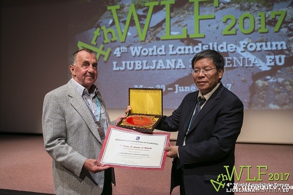 图为国际滑坡协会主席殷跃平为获得最佳论文奖的著名滑坡学者洪格尔(Hungr)教授颁奖。(王立朝 供图)